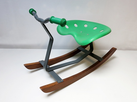 Plastic seat & hand grips, steel frame, exotic wood rockers. 100% recycled.