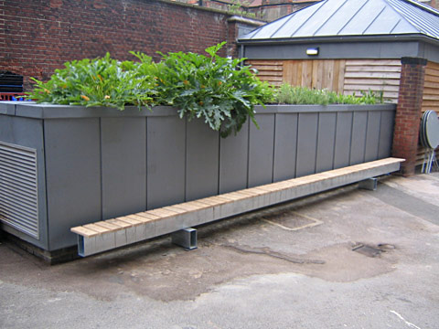 Bench constructed from galvanised steel box section and sawn European oak slats, with stainless steel fixings.