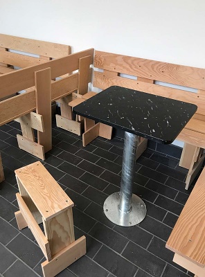 The plan consisted of a new floor of black quarry tiles, installing new central doors to link directly with outdoor space, re-surfacing existing picnic benches for use outside, and building a series of booths along the length of the room, in douglas fir, each booth having a table using the same re-cycled plastic sheet as used on the picnic tables. Facing out to the outdoor space we made two high counters using planks of an ash tree felled at the school a year earlier. The project was built as part of a D&T workshop with groups of kids form the school.